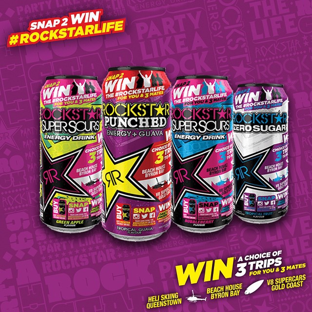 English: New Rockstar limited edition „Snap2Win“ for Australia. Available in Guava, Green Apple, Bubbleberry and Zero Sugar version with „#Rockstarlife“ contest.